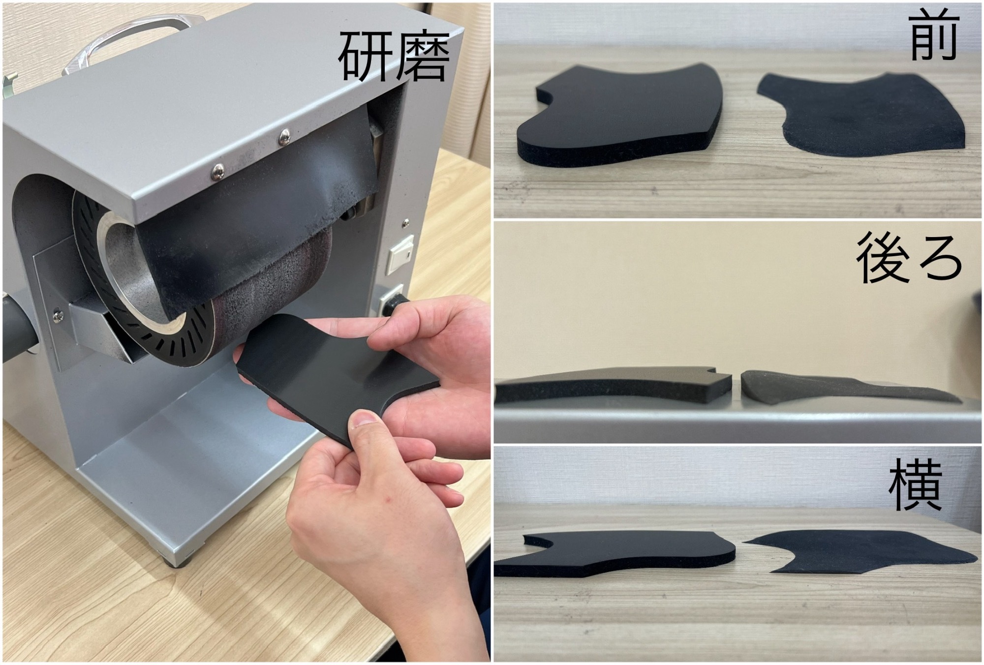 2.で決定したインソールの形を基にアーチパッドをグラインダーで削っていきます。